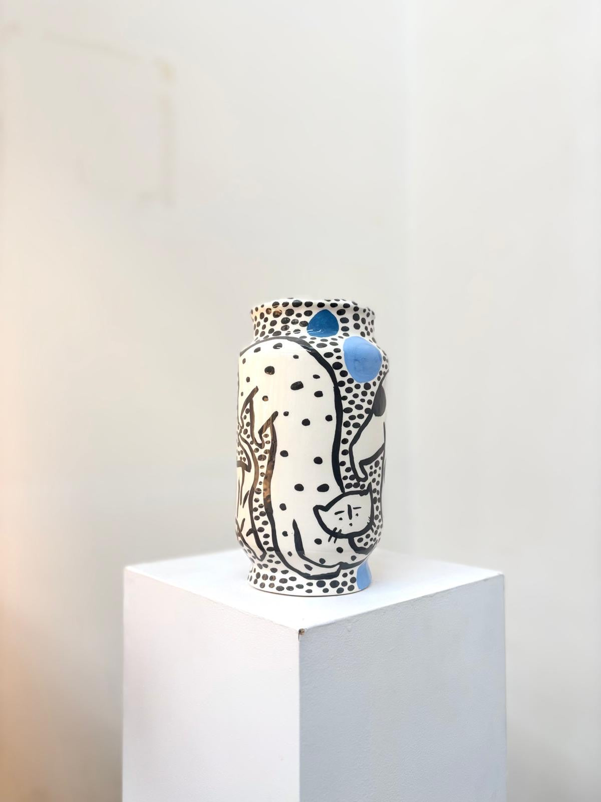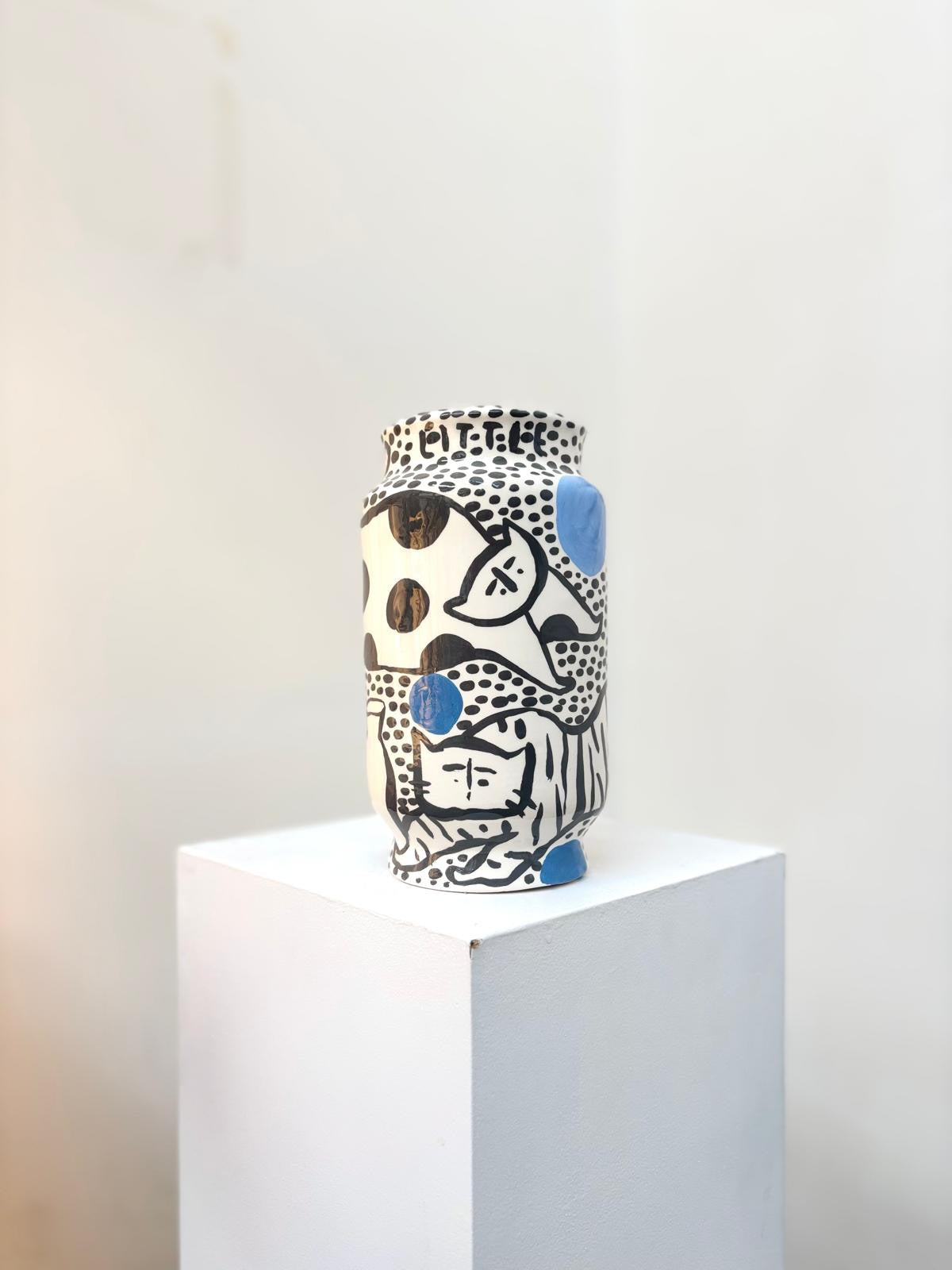 Cerámica hecha y pintada a mano. Barro blanco y engobe. Esmalte transparente brillo24 alto x 12 diámetro